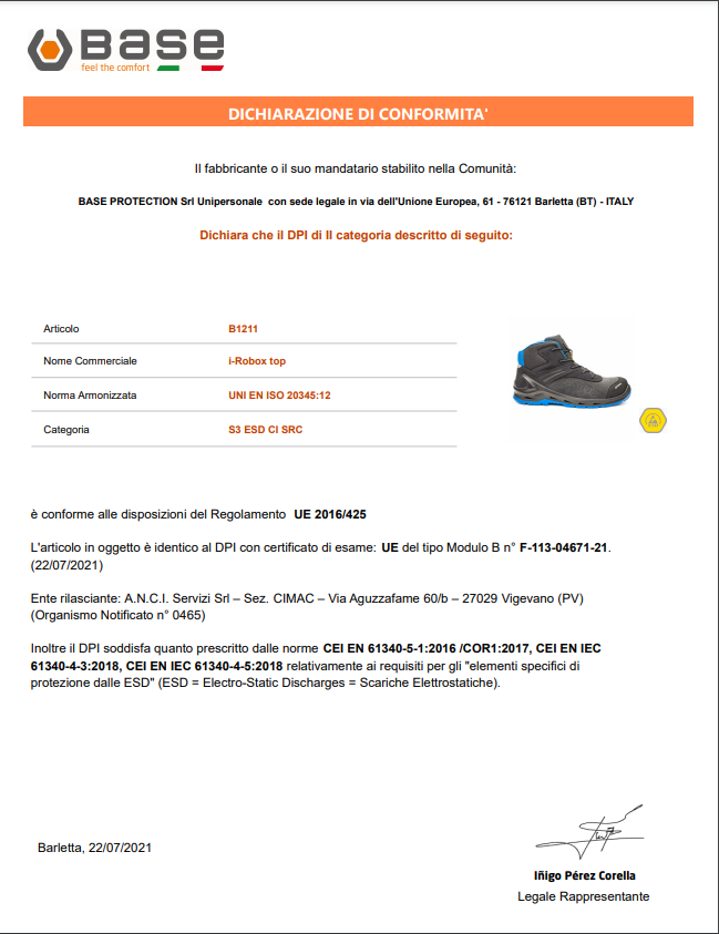 Conforme alle disposizioni del Regolamento UE 2016/425 L'articolo in oggetto è identico al DPI con certificato di esame: UE del tipo Modulo B n° F-113-04671-21. (22/07/2021)