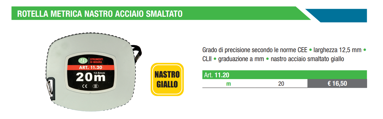 Rotella metrica 20 m, grado di precisione secondo le norme CEE,classe II. Nastro acciaio smaltato giallo, larghezza 12,5 mm, graduazione millimetrica.