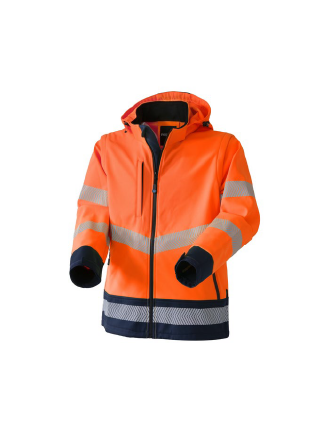 Giubbotto ad alta visibilità, in softshell a tre strati con interno foderato in micro-pile, collo alto, chiusura con zip waterproof. Il cappuccio è staccabile con zip. Taschino al petto e tasca interna con velcro, due tasche laterali con zip waterproof, polso regolabile con velcro. Le maniche sono removibili con zip, fondo posteriore arrotondato, inserti in tessuto di colore a contrasto, strisce rifrangenti anteriori e posteriori stampate a transfer con motivo diagonale. 5000 mm WP/800 MVP