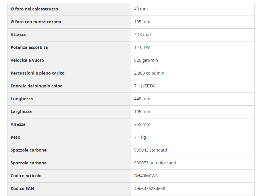 Martello combinato (perforatore-demolittore) super compatto, robusto e molto potente grazie al motore da 1.100W. L'attacco di tipo SDS-max ha un meccanismo che consente di posizionare lo scalpello con l'angolo di taglio voluto. Presenta una frizione di sicurezza, alta velocità di rotazione e una notevole energia di battuta per singolo colpo, 7.1 Joule ( EPTA). Le grandi leve dell'interruttore e del cambio ed il rinnovato design consentono prestazioni eccezionali e lavoro più comodo.
